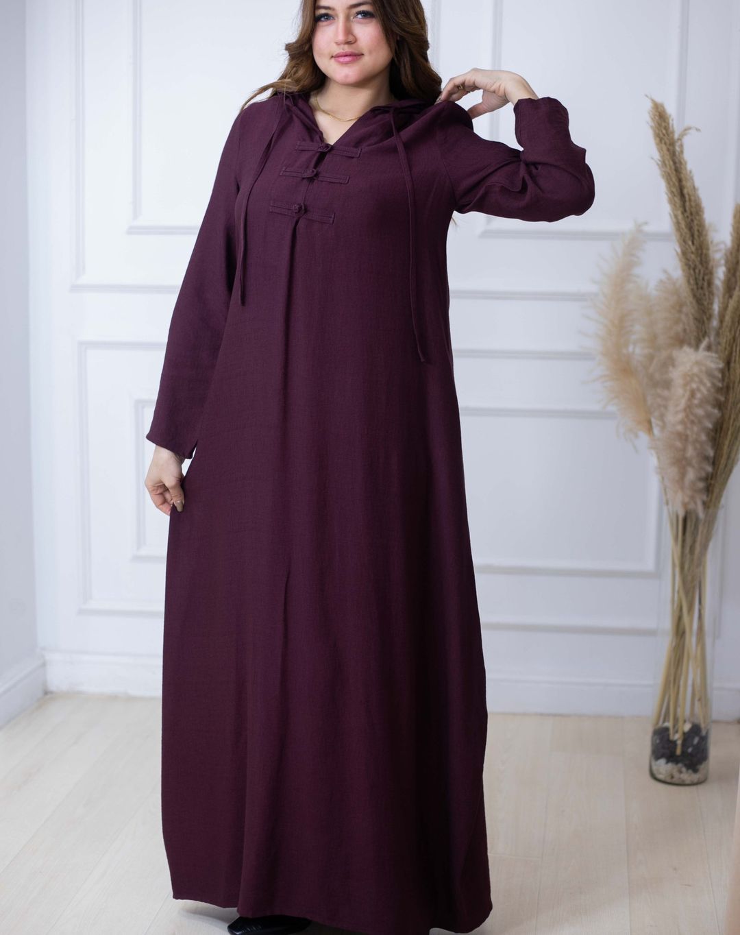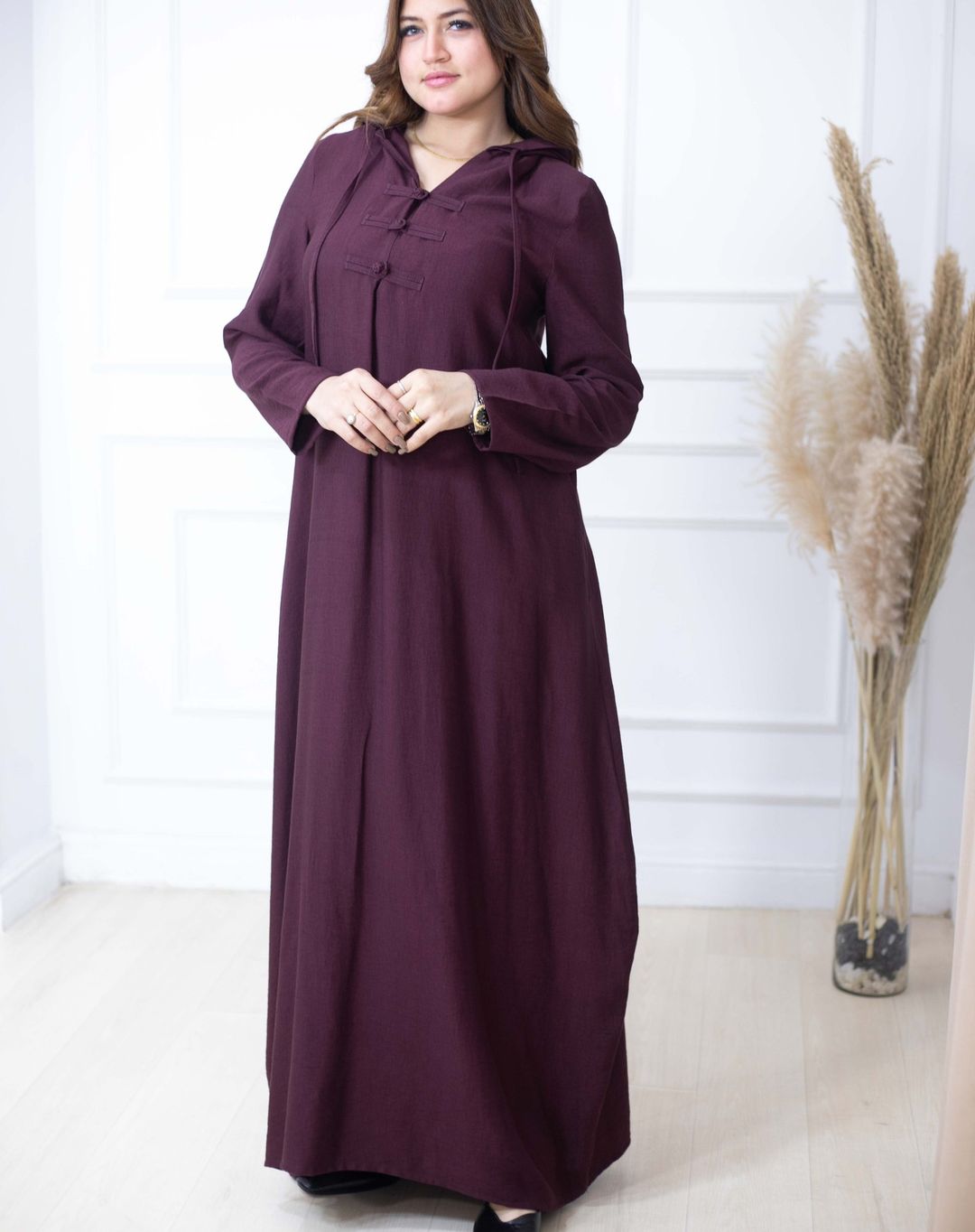 A refined linen kaftan with artisanal handmade buttons that add an elegant touch.