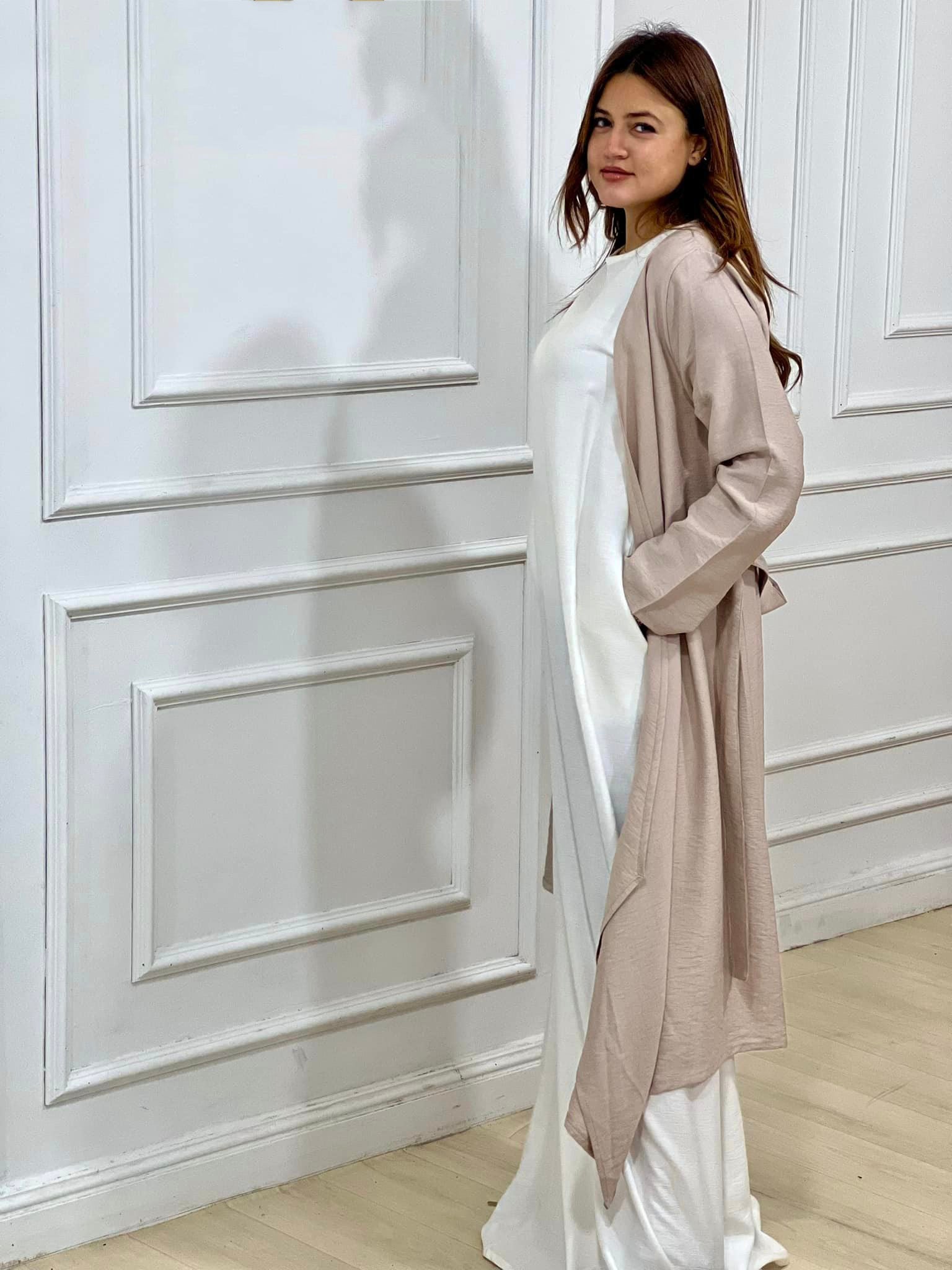 dress and cardigan set, linen two-piece set, modest outfit, mix and match outfit, white dress, black linen dress, navy cardigan, beige linen set, fashion for hijabi