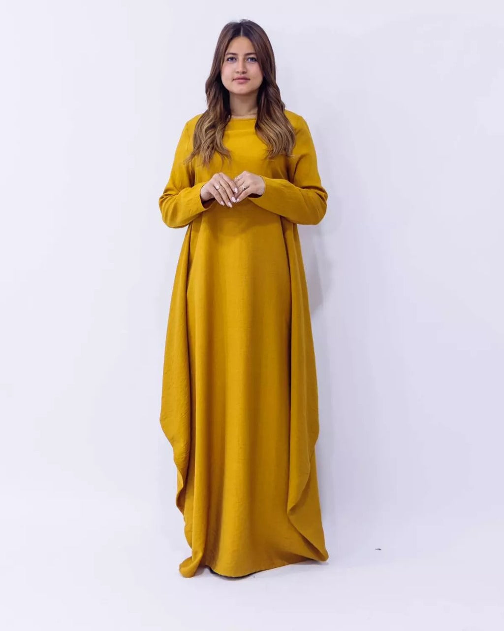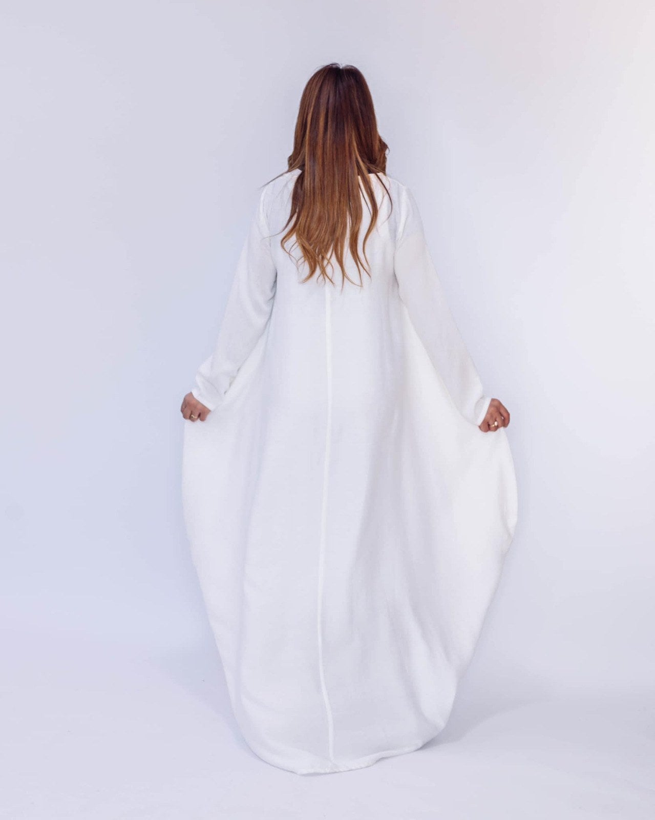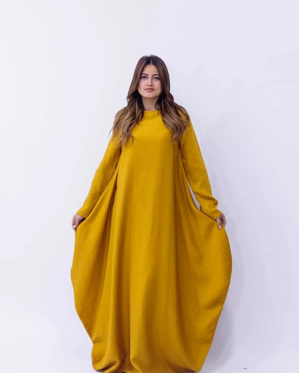 Made from breathable, soft linen, this dress features wide flowing sleeves and convenient side pockets—perfect for daily wear or summer days.