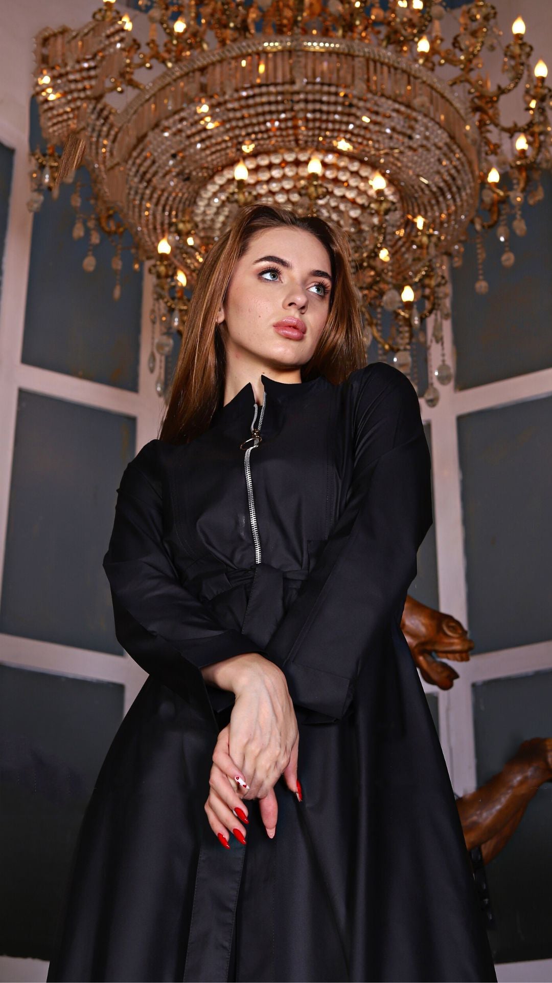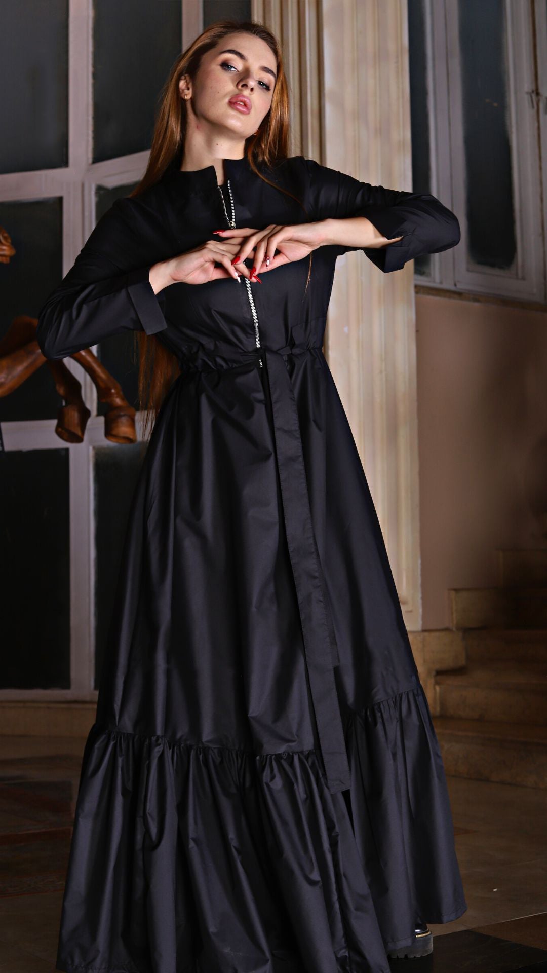 long sleeve modest dress, metal zipper dress, olive dress, black varna dress, adjustable waist dress