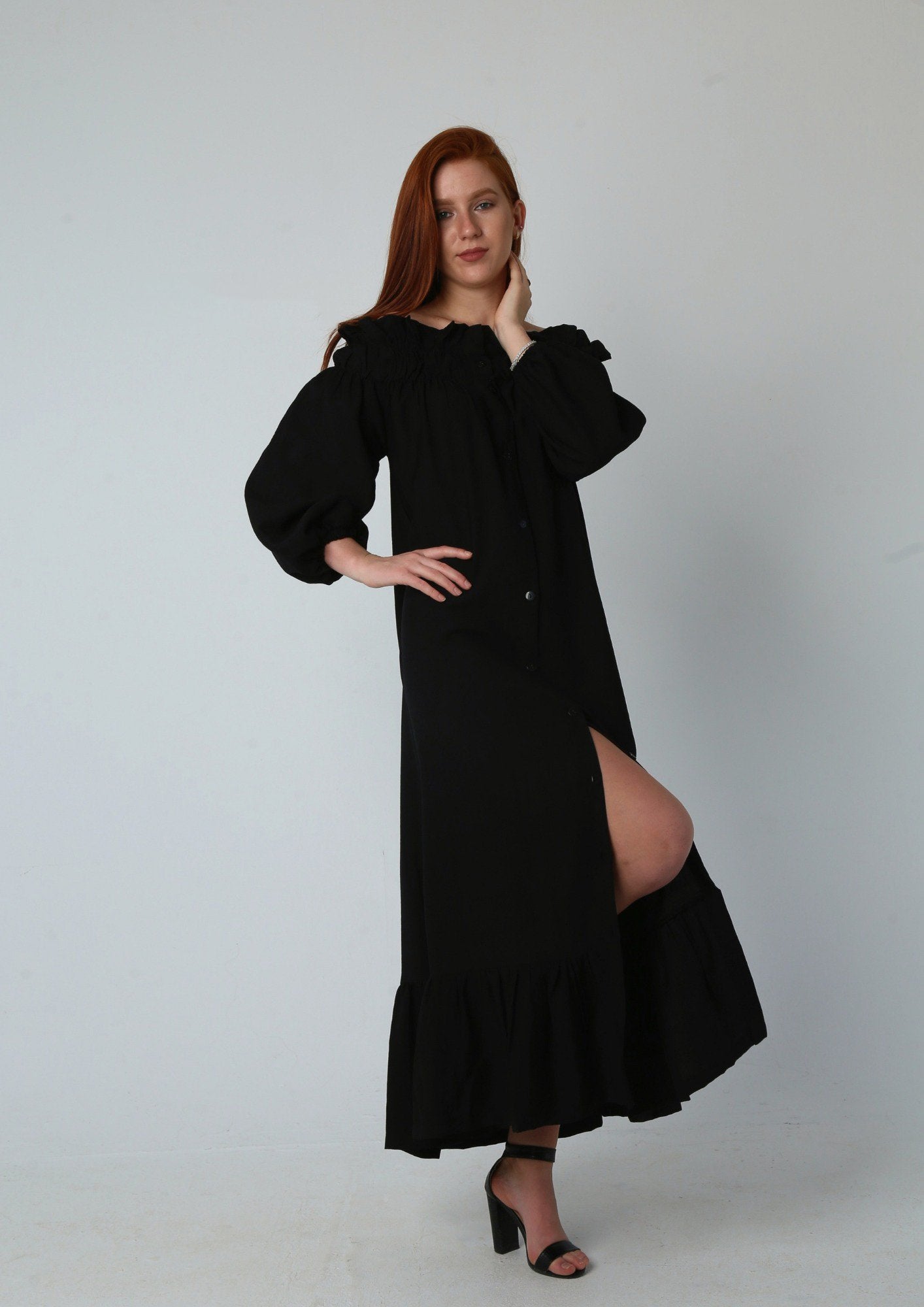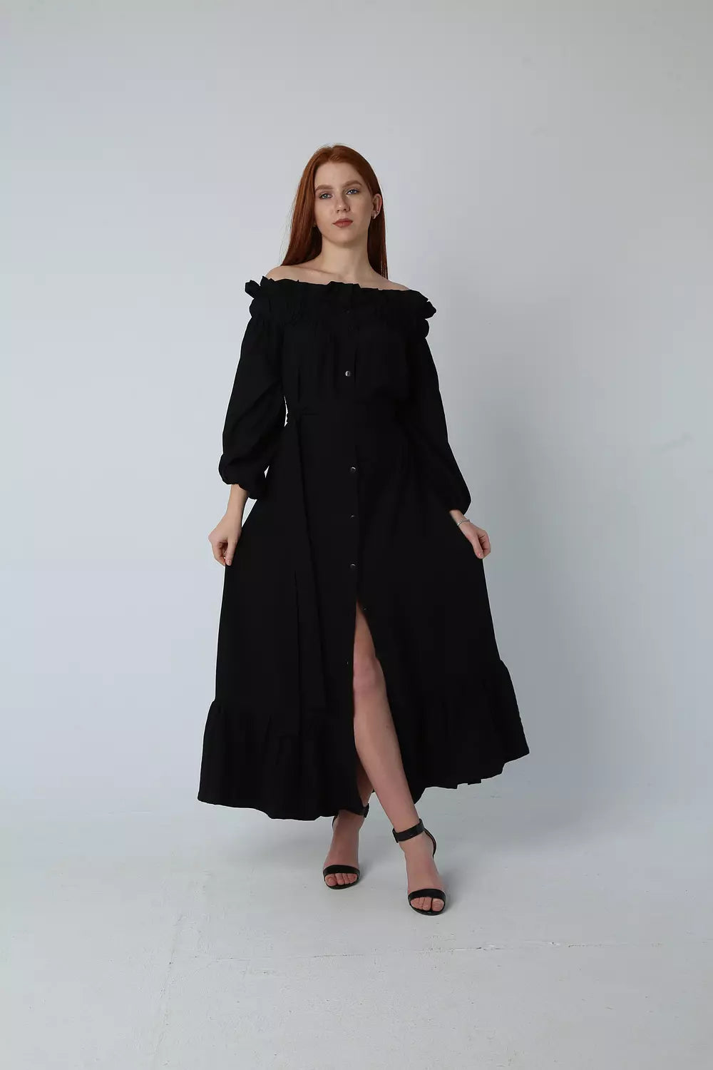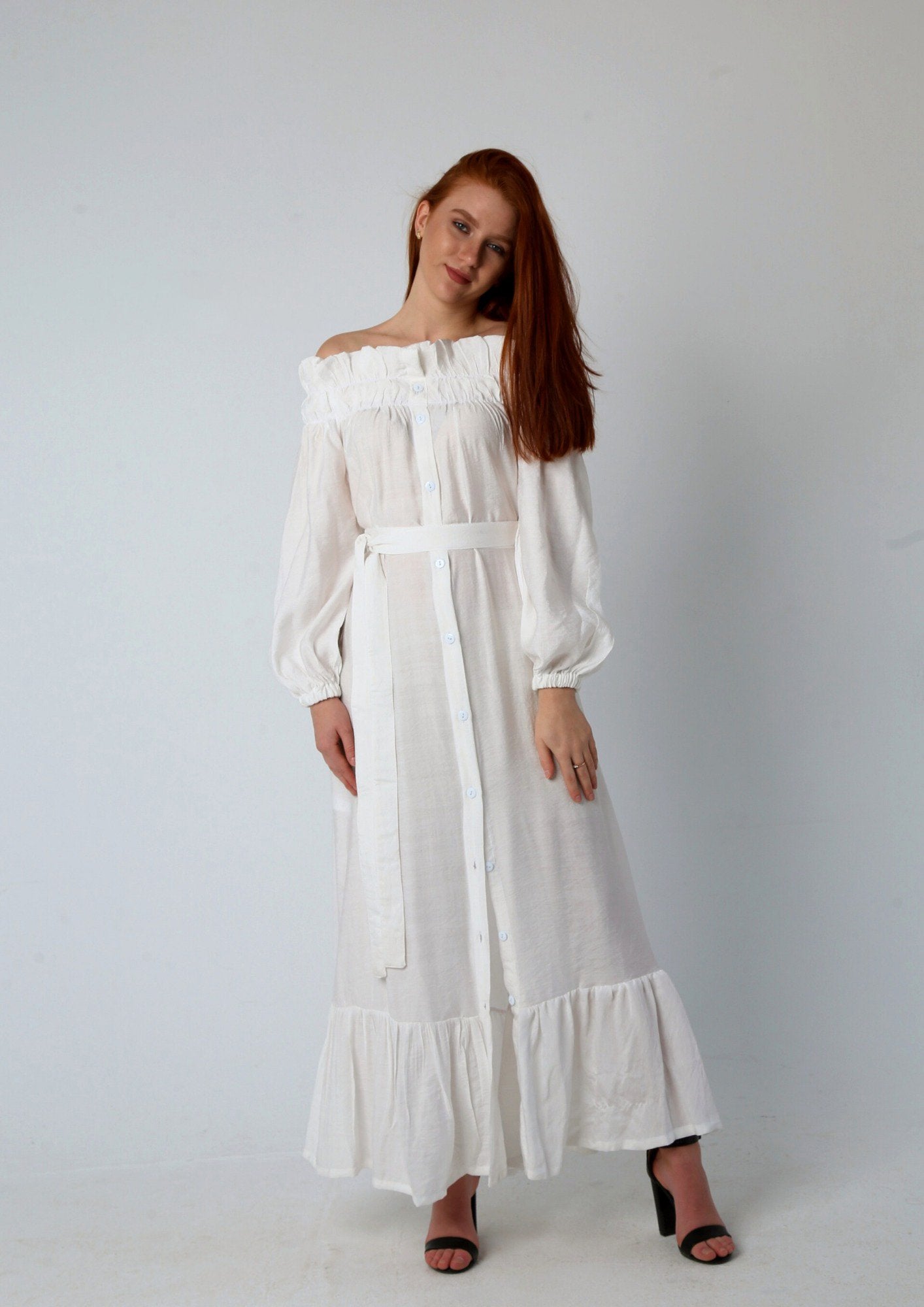linen off-shoulder dress, button front dress, summer linen dress, white black linen dress, boho linen dress, casual off shoulder dress, belted linen dress