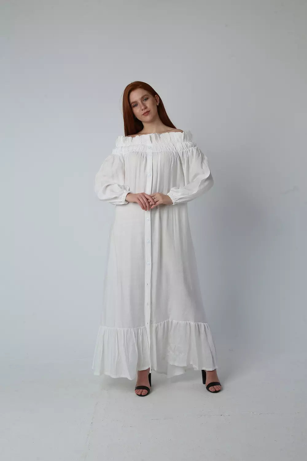 Stay effortlessly elegant in this off-shoulder linen dress, crafted from breathable natural fabric.