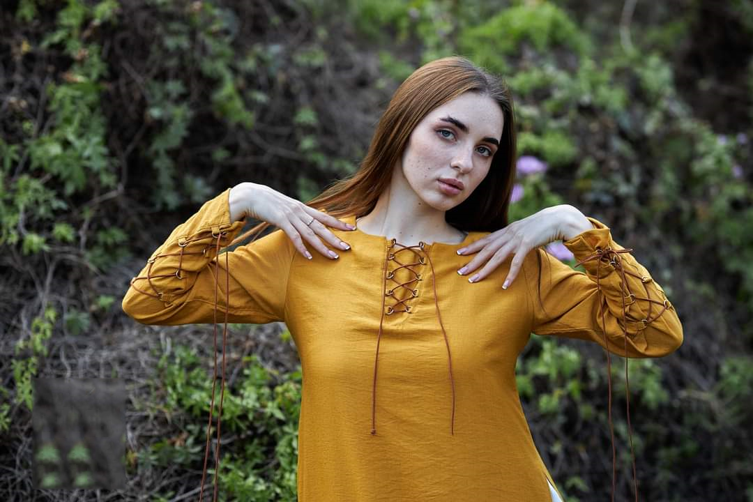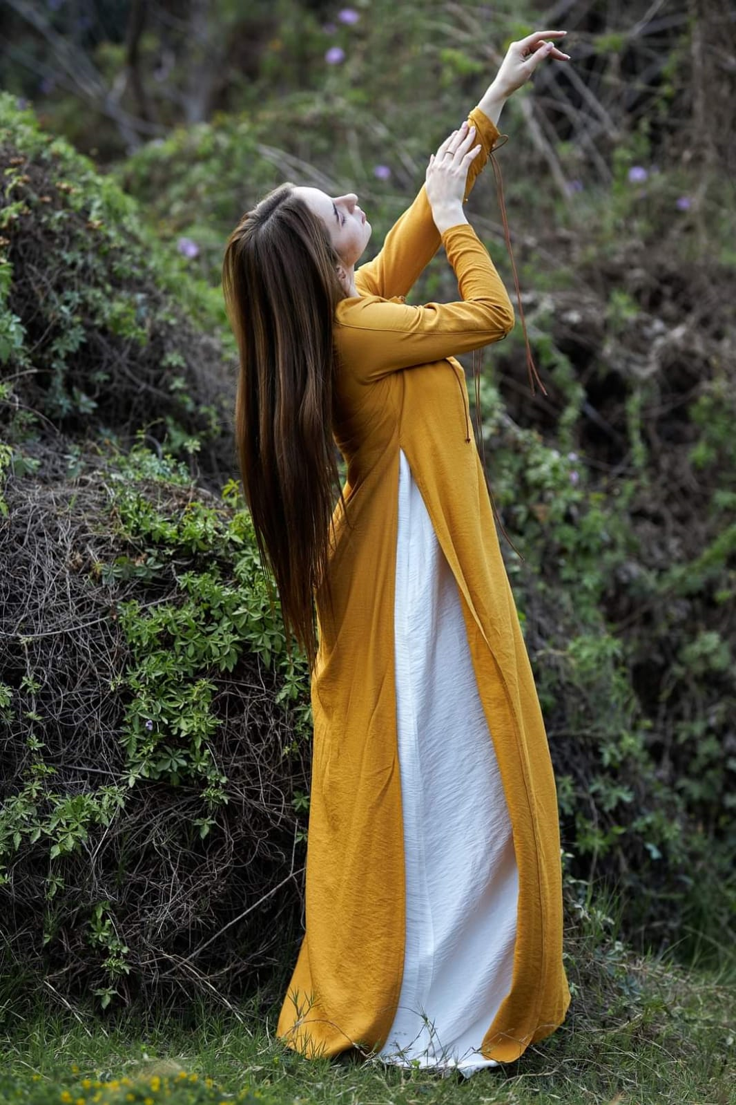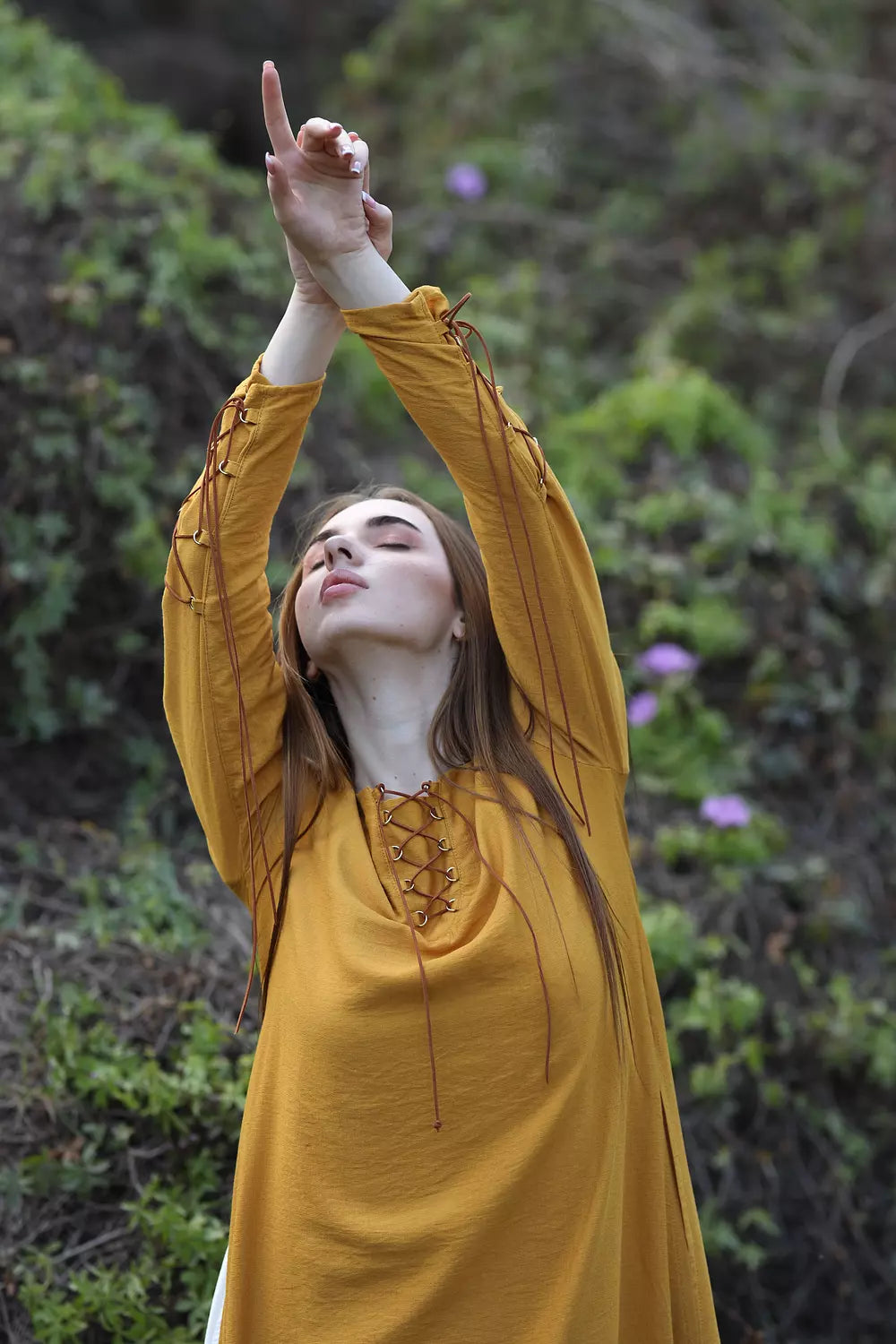 Layered on top is a mustard suede overlay dress featuring metal ring details on the shoulders and a wide waist tie for added style.
