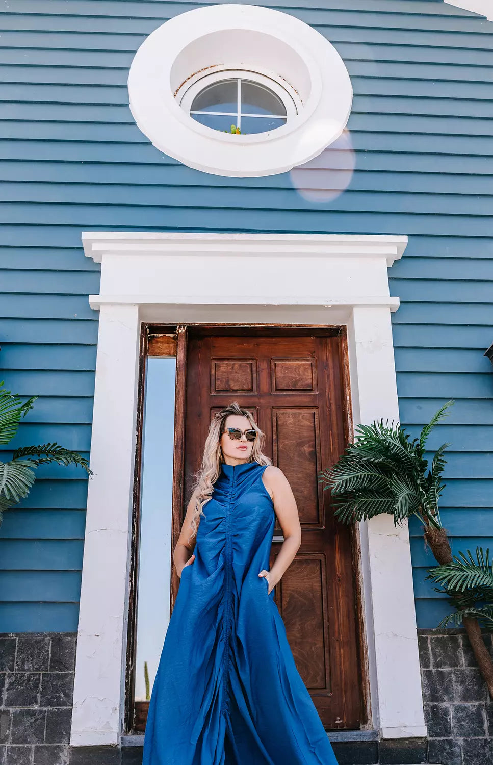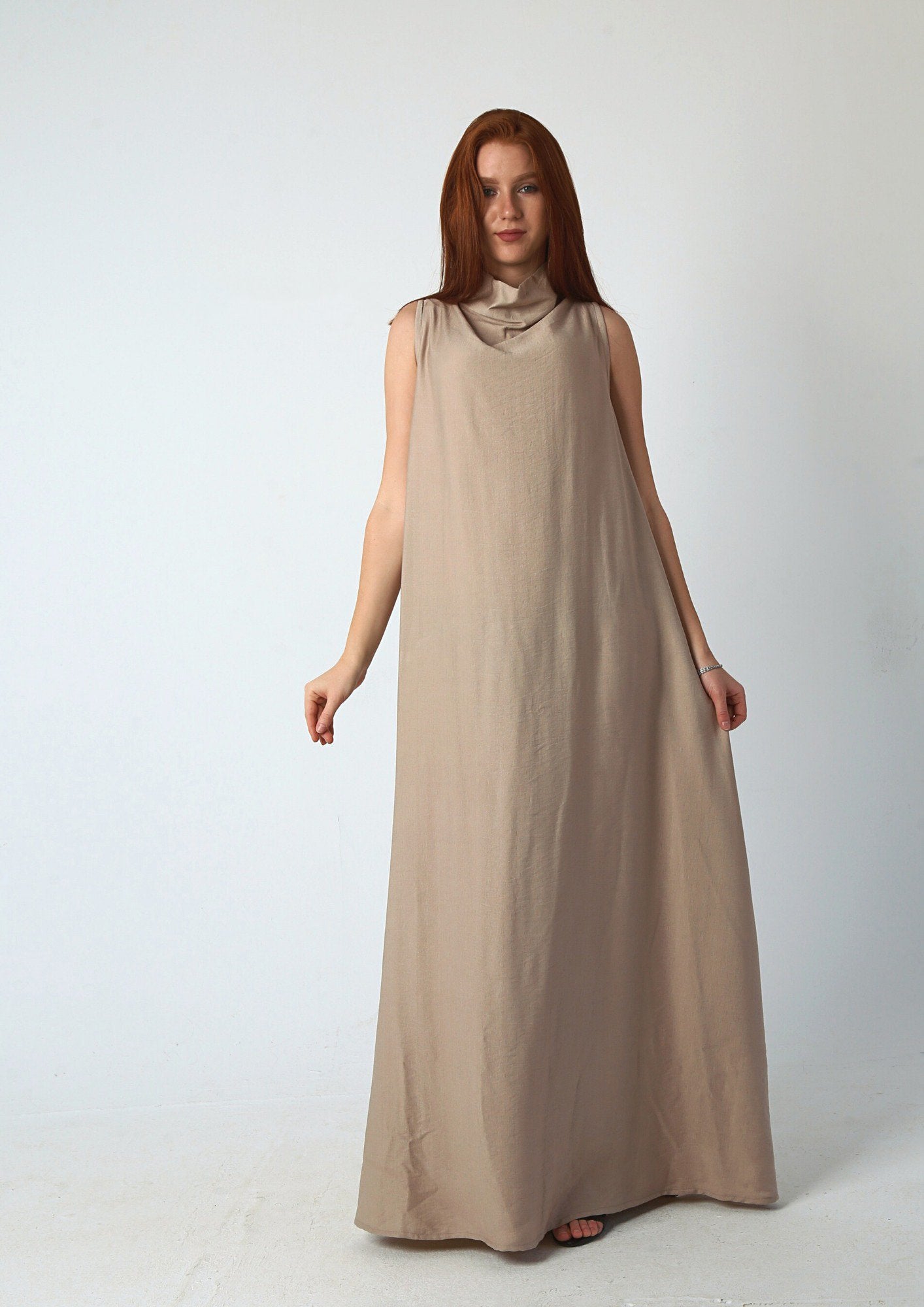 reversible dress, sleeveless linen dress, front tie dress, back tie dress, two-way dress, beige linen dress, navy linen dress, modest summer dress